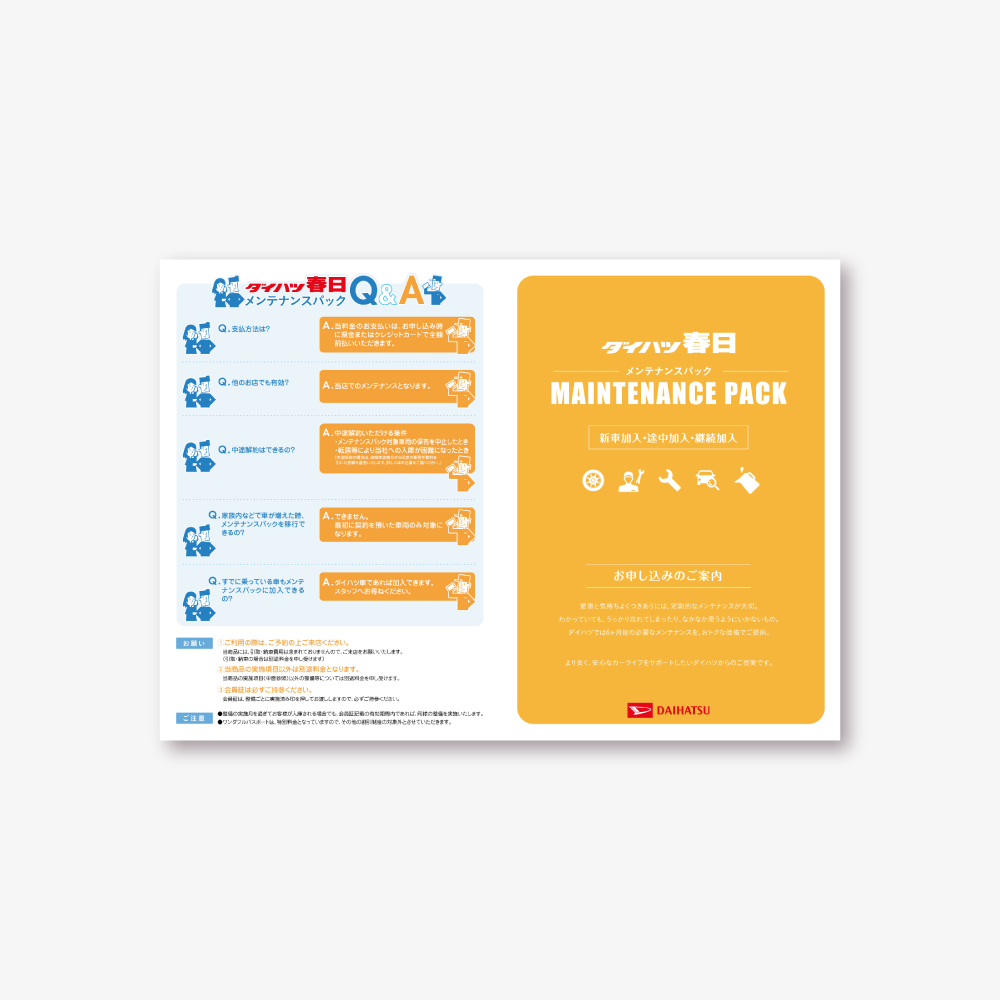 車検などダイハツで対応しているメンテナンス関係の紹介パンフレット。中の表組はInDesignを使って、一目で価格や対応するプランが分かりやすように色分け、線の強弱などを工夫している。また、Q&Aの欄で使っているイラストもシンプルなパンフレットのデザインに合うように自分で書き起こした物を使用した。